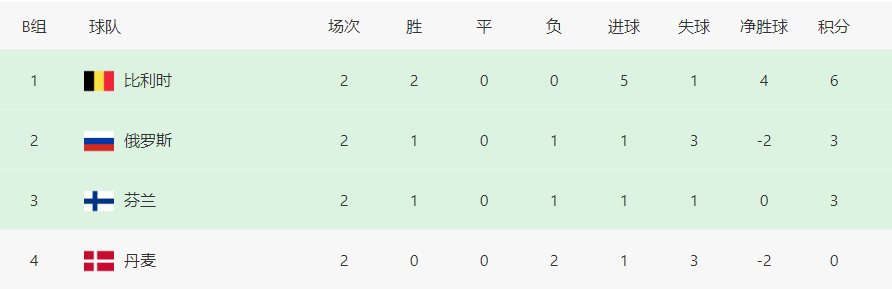 为何说丹麦最后一轮还有机会竞争小组第二。首先来看B组最新积分榜,比利时6分排名第一,俄罗斯3分排名第二、芬兰3分排名第三,丹麦0分排名垫底。
