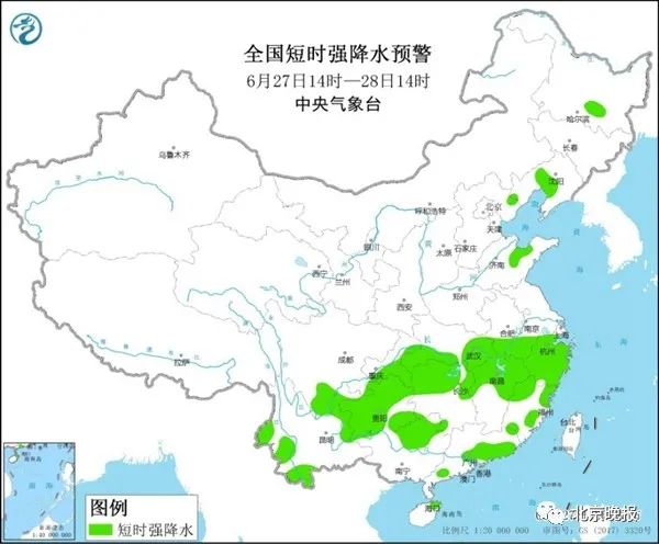 预计6月27日14时至28日14时,宁夏北部、内蒙古东北部、黑龙江东部、河北北部和西部、山东中北部、安徽南部、湖北西南部、湖南西部、江西北部、浙江北部和东南部、贵州西部、广西北部等地的局地将有8~10级雷暴大风或冰雹天气。