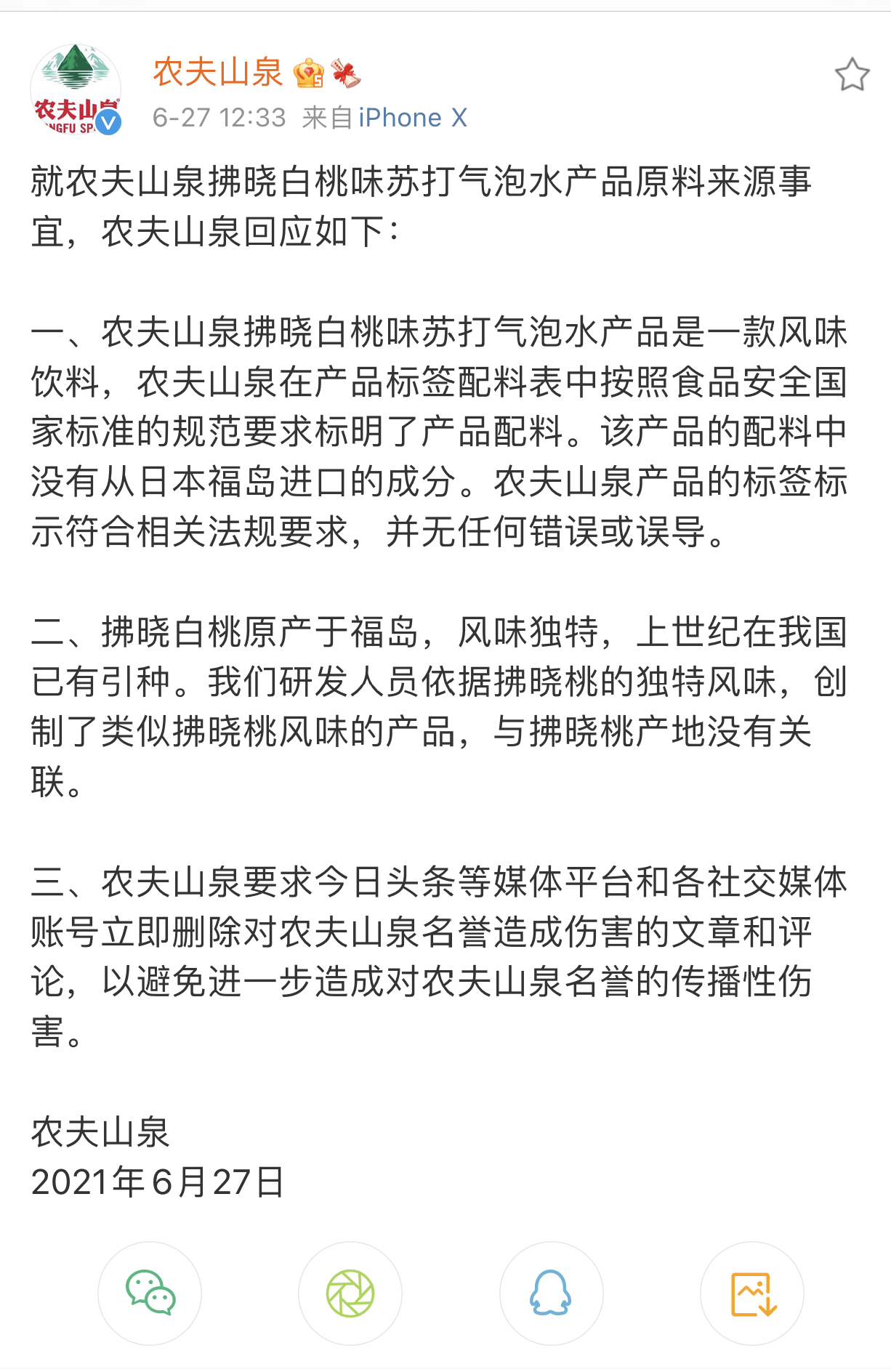 农夫山泉回应称,农夫山泉拂晓白桃味苏打气泡水产品是一款风味饮料,在产品标签配料表中按照食品安全国家标准的规范要求标明了产品配料。拂晓白桃原产于日本福岛,风味独特,上世纪在我国已有引种。农夫山泉研发人员依据拂晓桃的独特风味,创制了类似拂晓桃风味的产品,与拂晓桃产地没有关联。