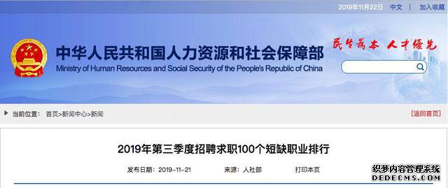 据人社部官网发布的消息,近日,中国就业培训技术指导中心发布102个定点监测城市公共就业服务机构人力资源市场《2019年第三季度全国招聘求职100个短缺职业排行》。