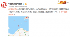 据中国地震台网正式测定:03月06日08时21分在山东烟台市蓬莱区海域(北纬38.00度,东经120.41度)发生3.0级地震,震源深度8千米。
