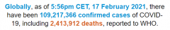 根据世卫组织最新实时统计数据,截至欧洲中部时间2月17日17时56分(北京时间2月18日0时56分),全球累计新冠肺炎确诊病例109217366例,累计死亡病例2413912例。17日全球新冠肺炎确诊病例