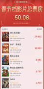 猫眼数据显示,春节档影片总票房已超50亿元。其中,《唐人街探案3》总票房超27亿元,《你好,李焕英》总票房超12亿元。
