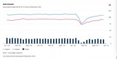 △ 德国联邦统计局发布的外贸走势图,其中蓝线为出口,红线为进口,柱形为贸易顺差 受疫情背景下国与国之间边境临时关闭,物流、供应链中断等问题影响,德国2020年全年的出口商