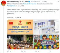 1月27日,中国驻斯里兰卡大使馆在社交平台发文称,中方将向斯里兰卡捐赠国药集团生产的30万剂新冠病毒疫苗。 推文配图有同经风雨,共克时艰八个字。驻斯里兰卡大使馆表示,中国
