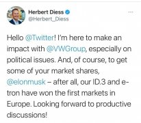 1月21日消息,大众CEO赫伯特迪斯(Herbert Diess)于当地时间周三正式入驻了社交媒体推特,并很快发布了第一条动态,这条动态内容直指其竞争对手特斯拉,并喊话特斯拉CEO埃隆马斯克(