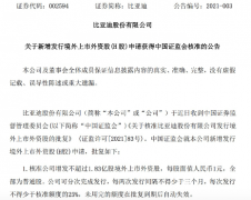 【TechWeb】1月15日消息,比亚迪发布公告称,于近日收到中国证监会《关于核准比亚迪股份有限公司发行境外上市外资股的批复》。 根据公告,中国证监会核准公司增发不超过1.83亿股境
