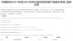C114讯 4月6日消息(九九)中国移动日前发布2021年至2023年风冷型列间空调产品集中采购招标公告,采购规模约为1585台。根据室内机规格分为300型(室内机面宽300mm)和600型(室内机面宽