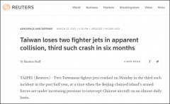 22日,台军2架战机在训练中碰撞导致坠海,目前已有一名飞行员确认死亡。不过,路透社在报道此事时,却把台军这次训练事故怪到了大陆头上。 图源:路透社 路透社在报道中称,本