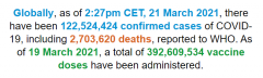 根据世卫组织最新实时统计数据,截至欧洲中部时间3月21日14时27分(北京时间3月21日21时27分),全球累计新冠肺炎确诊病例122524424例,累计死亡病例2703620例。21日全球新冠肺炎确诊病