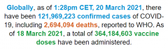 根据世卫组织最新实时统计数据,截至欧洲中部时间3月20日13时28分(北京时间3月20日20时28分),全球累计新冠肺炎确诊病例121969223例,累计死亡病例2694094例。20日全球新冠肺炎确诊病