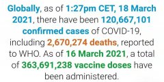 世界卫生组织18日公布的最新数据显示,全球累计新冠确诊病例达120915219例。 世卫组织网站最新数据显示,截至欧洲中部时间18日16时53分(北京时间23时53分),全球确诊病例较前一日增 ...