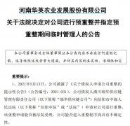 【大河报大河财立方】(记者 王磊彬)6月6日,河南华英农业发展股份有限公司(以下简称华英农业或*ST华英)发布公告称,信阳市中级人民法院(以下简称信阳中院)决定对公司进行