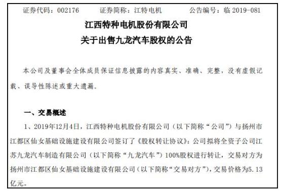 因新能源而起的九龙汽车随补贴退坡等陷入困境。12月5日晚间,江特电机(002176)公告称,公司拟将全资子公司九龙汽车100%股权进行转让,交易对方为扬州市江都区仙女基础设施建设有限公司(以下简称“扬州建设公司”),交易价格为5.13亿元,江特电机已于12月4日与扬州建设公司签订了《股权转让协议》。