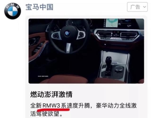 距离上次奥迪Q8放错内容还不到一个月,12月5日,朋友圈广告再次翻车,不过这回不是奥迪了,而是与奥迪并称三大豪华品牌之一的宝马。宝马为自家中级轿车宝马3系在朋友圈做广告,虽然视频内容播放的是宝马3系轿车,但是文字介绍中,却将代表宝马的“BMW”字母,错误的写成了“RMW”。