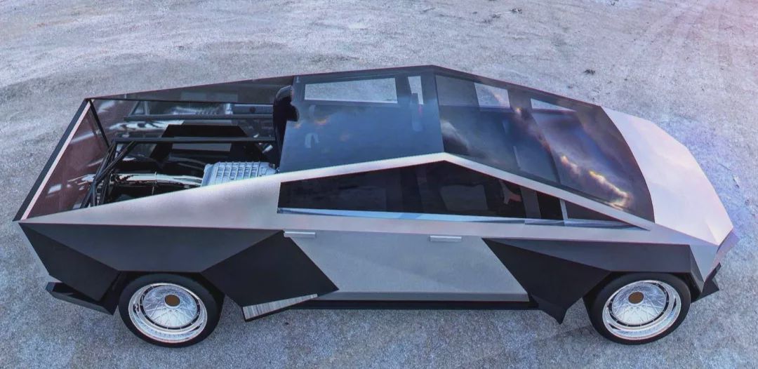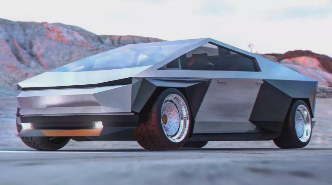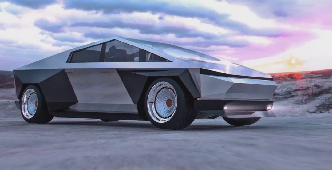 Abimelec Design改变了Cybertruck的外观,车辆采用了反光的车身面板,以及80年代风格的复古轮毂,而翼子板进行了同样具有棱角的加宽处理,也让Cybertruck拥有了双色调效果,看起来更有个性,倍具科幻风格。