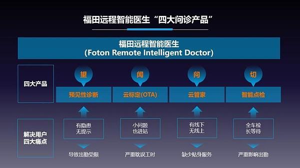 2020年3月5日,福田汽车远程智能医生首批预见性服务产品功能正式上线,依托远程智能医生为用户提供更智能、更高效、更便捷的远程服务;通过预见性诊断实现保养提醒、故障预判;借助云管家实时掌控车辆状态;云标定(OAT)服务通过远程零成本的升级服务模式,实现场景化标定数据精准匹配,更经济、更安全,帮助运输人全面提高车辆全生命周期价值。
