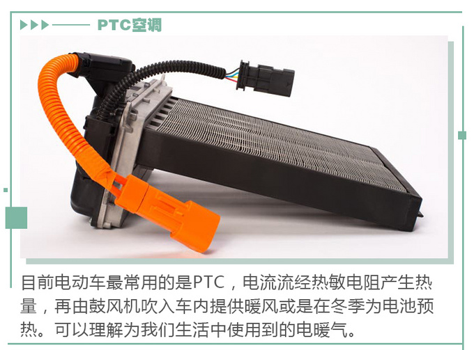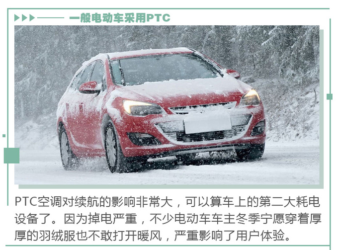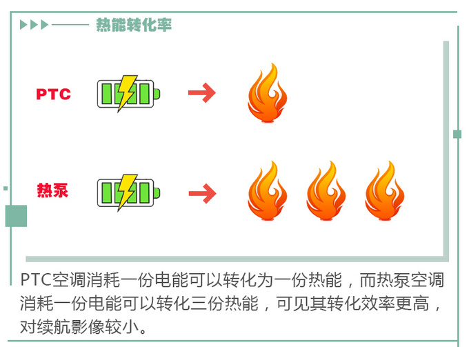 目前大部分电动车所采用的制热方式都是PTC空调,它的缺点很明显,就是耗电量大。这是因为根据热力学第一定律:热量可以从一个物体传递到另一个物体,也可以与机械能或其他能量互相转换,但是在转换过程中,能量的总值保持不变。PTC空调会将电能全部转化为热能,所以效率约为100%。而热泵空调的优势就是它的效率更高。电能、氟利昂自身能量以及从外界吸收的能量都会转化为最终的热能,效率约为300%,产生同样的热量,能耗却只有传统PTC空调的三分之一。