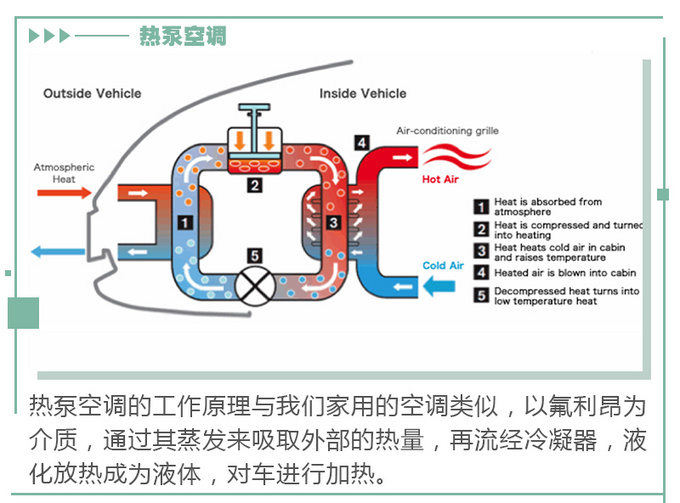 热泵空调利用了热交换原理,整个制热过程与我们日常使用空调制冷的运转方向相反,就好比把吹热气的室外机和吹冷气的室内机调换一个位置。制热时,气体氟利昂被电动压缩机加压成为高温高压气体,经过冷凝器,冷凝液化放热成为液体,同时对车内空气进行加热。而冷凝后的液体又会流经蒸发器,吸收外部环境中的热量,成为气体氟利昂再次进入压缩机开始循环。