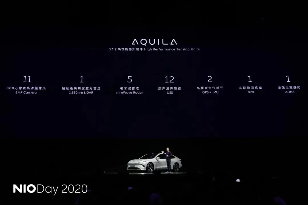 ET7不同于市面上采用液态锂电池的产品,其可选择搭载70/100/150kWh的固态电池包,最大续航超过1000km。除此之外,ET7作为蔚来首款具备自动驾驶功能的电动轿车,被官方称为“为自动驾驶而生”,基于NT2.0自动驾驶平台,ET7还搭载蔚来自主研发的Aquila超感系统,其拥有33个高精度传感器,包括11个800万像素的高清摄像头和1个激光雷达,同类型的特斯拉FSD只采用了120万像素的摄像头。