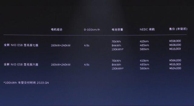 12月28日晚上,蔚来汽车于深圳举行了2019年NIO Day,活动上发布了全新ES8,共推出6款普通版车型以及6款签名版车型。普通版ES8六座车型补贴后官方售价为46.8-53.4万元;七座车型补贴前售价为46.8-52.6万元;签名版ES8六座车型补贴前售价为56.6-62.4万元,七座车型补贴前售价为55.8-61.6万元。新款ES8对外观、内饰细节方面进行了升级,70kWh、84kWh、100kWh三款不同电池容量的车型,NEDC续航分别为415、485km、580km,产品力得到大幅提升。