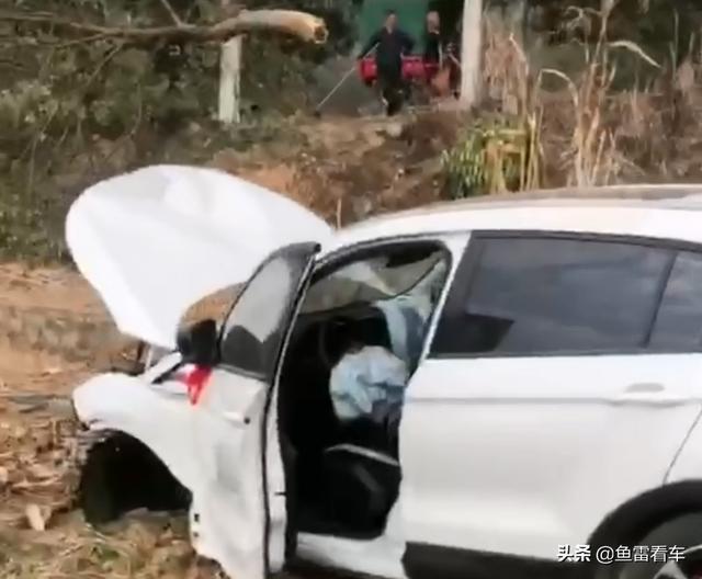 视频是从尾部开始的,可以看到距离马路路面竟然有两米的落差,当然这是翻滚不是直接跌落,直接跌落即使两米高度这车即使没事车主也难受,驾驶一侧门打开,说明车主安然无恙;同时注意顶端红圈内那颗断裂的大树,断裂口的横切面可不算小呀!已经超过碗口粗了,接近盘子直径,记住这还有一个远近关系在里面,观致5S处于近处,断裂的大树位于远处,对比后端马路上的人物大小就明白了,当然事故原因自然是不清楚,是新手原因在这种复杂路况下偶遇突然情况猛打方向导致的撞击还是其它什么原因就不谈了,总之就是撞断了一颗大树翻滚到路基下方。