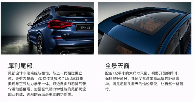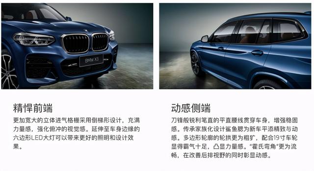 外观方面,强健精悍,动人心魄。BMW X3的设计,只需一眼,便为动感强健的气质深深吸引。BMW X3的耀眼设计演绎豪华SUV气息。和谐的比例、俐落的轮廓,加上宽阔的车头与车尾,无不让人留下深刻感受。
