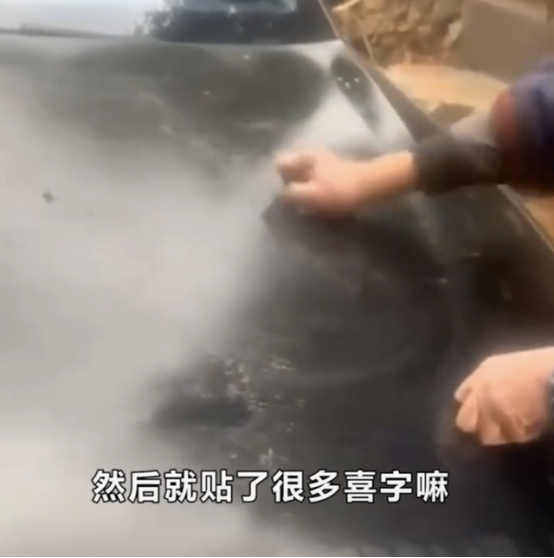 在接亲结束之后,他和他的父亲都想尽了一切办法要把车身清理干净,可无奈车身上面还是有很多贴胶痕迹。