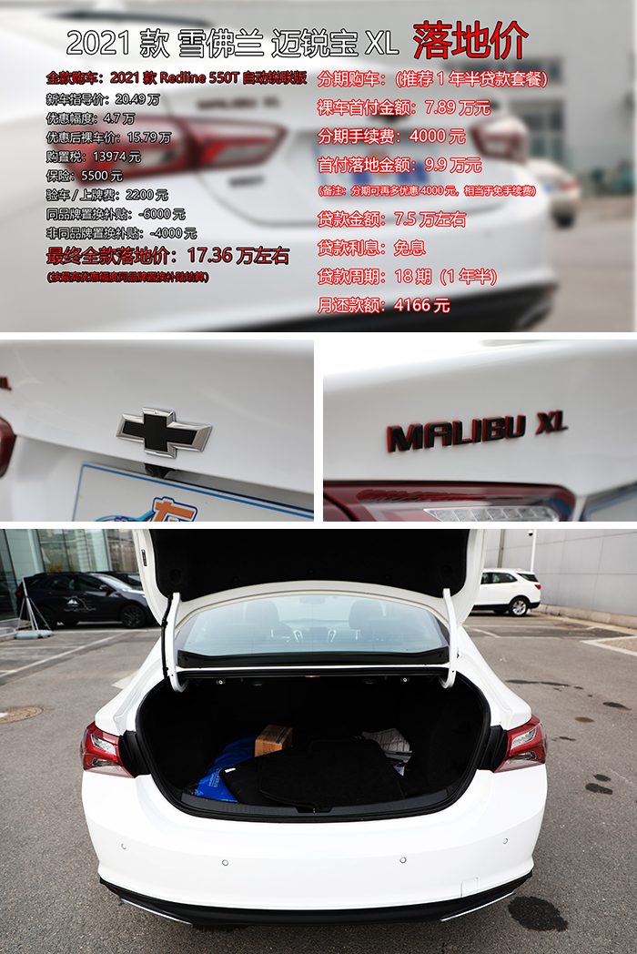 既然选好了车型,那郝哥就来为您算算落地价,新车官方指导价20.49万元,优惠4.7万元以后裸车价为15.79万元,购置税为13974元,保险费用预计5500元左右,上牌验车费是2200元,值得一提的是,同品牌置换还可享受6000元置换补贴;非同品牌置换也能享受4000元置换补贴,假如按照最高优惠计算(6000元置换补贴),最终全款落地价预计为17.36万元,与其它某些4S店不同的是,郝哥暗访的雪佛兰4S店只需在店内上商业险便可销售全国各地,尤其是北京周边城市的朋友可以对比一下价格,看看哪里购买更加划算。