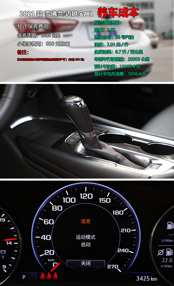 养车成本方面,雪佛兰迈锐宝XL保养周期为5000公里,小保养费用预计600元左右,目前店内有充值活动,充值五次小保养可赠送价值300元的清洗节气门服务。油耗方面,郝哥推荐车型为2.0T排量,工信部油耗显示为百公里6.7升,为了更接近真实,郝哥以再增加2个油计算,也就是8.7升,以目前北京地区95号汽油7.01元每升,每年行驶20000公里举例,迈锐宝XL的年油费预计为12197.4元,平均月油费为1016.4元,以上数据也仅为粗略估算,仅供参考。