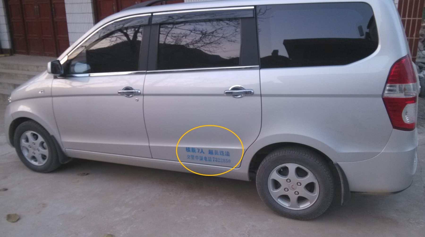 大概内容就是写核载七人以及举报电话之类的。而车管所给出的理由就是像这样的大型车车门旁边都需要喷漆,因为他们担心会有人拿家用车做商用车,车主表示可以接受车管所这样的做法,因为毕竟这只是为了大家的安全着想,而且因为这也确实是法律规定,如果不喷这个漆的话确实有不法分子可能会拿家用车做商业用途。