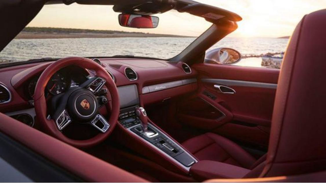 Boxster 纪念版车型各方面方面都非常突出。亮棕色车身、波尔多红真皮内饰、红色织物顶篷,顶篷上的“Boxster 25”标志意义非凡。
