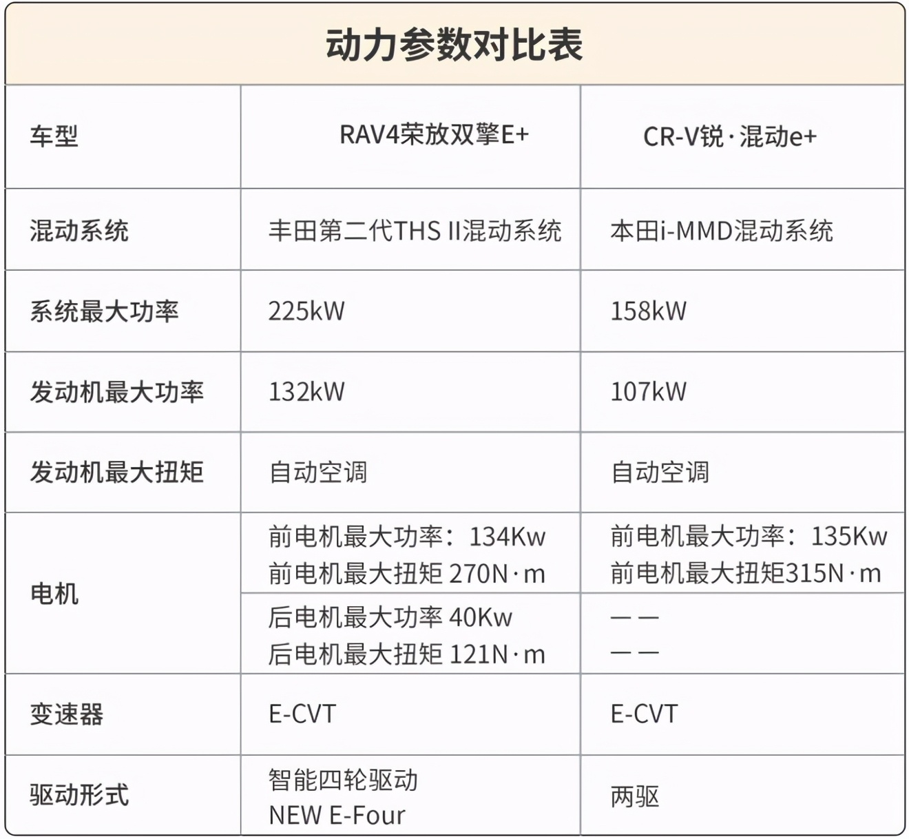 这套系统由2.5L阿特金森循环四缸汽油发动机+双电机组成的插电混动总成,是丰田全球先进的第四代三电技术,其单独的2.5L发动机最大功率就有132kW,加上前后双电机后的综合最大功率更是高达225kW,这样的动力数据在同级车型中无人能及,从其与CR-V锐·混动e+的如下对比中就能窥探一二。