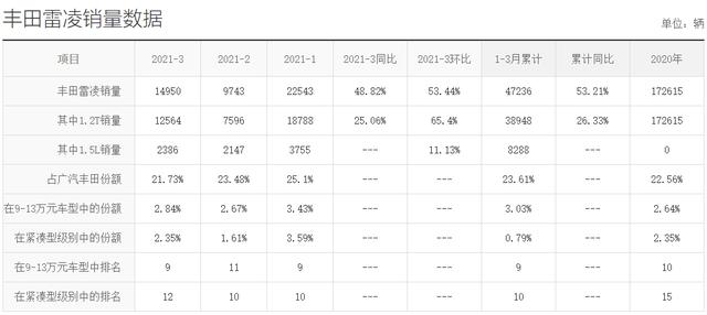 从上市后的销量结构来看,雷凌主要销量来源还是1.2T车型。以3月份销量为例,雷凌当月销量为14950辆,其中1.2T销量12564辆,1.5L销量仅为2386辆。虽然1.5L发动机的动力参数高于1.2T,但是消费者并不买账,还好广汽丰田没有抛弃1.2T发动机,不然雷凌就凉凉了。