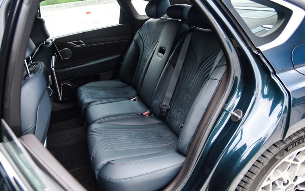来到后排,由于捷尼赛思G80的轴距超过了3米,所以空间表现也是肉眼可见的大。座椅则采用了Nappa真皮座椅,不仅纹路设计用心,整体还很宽大,乘坐舒适性不用担心。