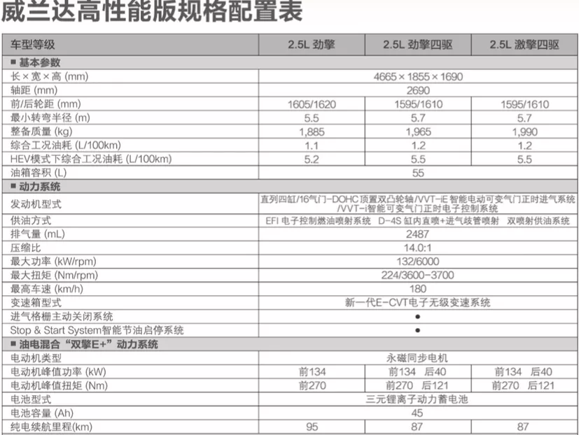 得益于新开发的三元锂离子动力蓄电池,威兰达高性能版的的驱动电机可输出134kW的峰值功率,270N·m的峰值扭矩,E-FOUR电子四驱版还搭载了峰值功率40kW,峰值扭矩121N·m的后驱电机。