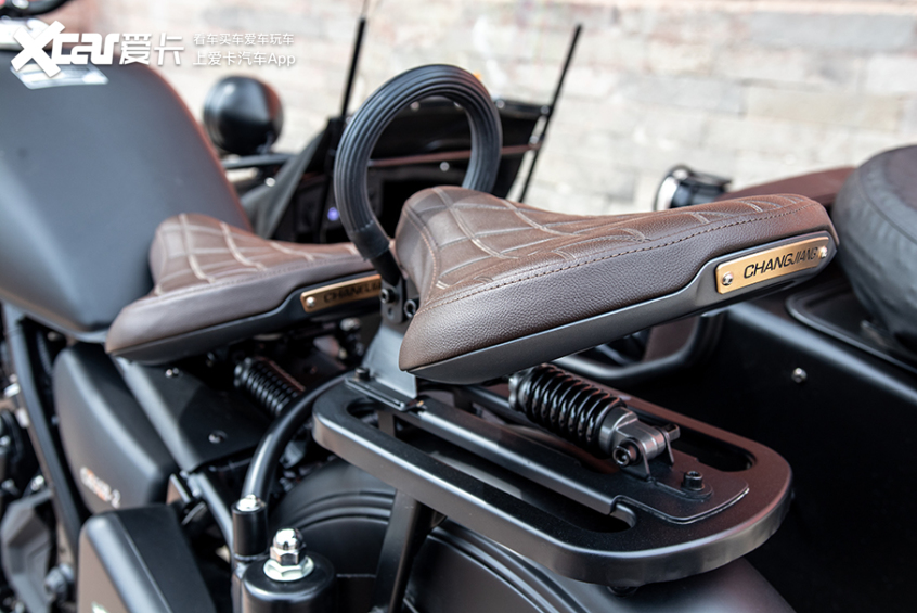 带弹簧的车座也是老款长江750的标志性设计,而定制版的不同之处在于,采用了铝合金坐垫。