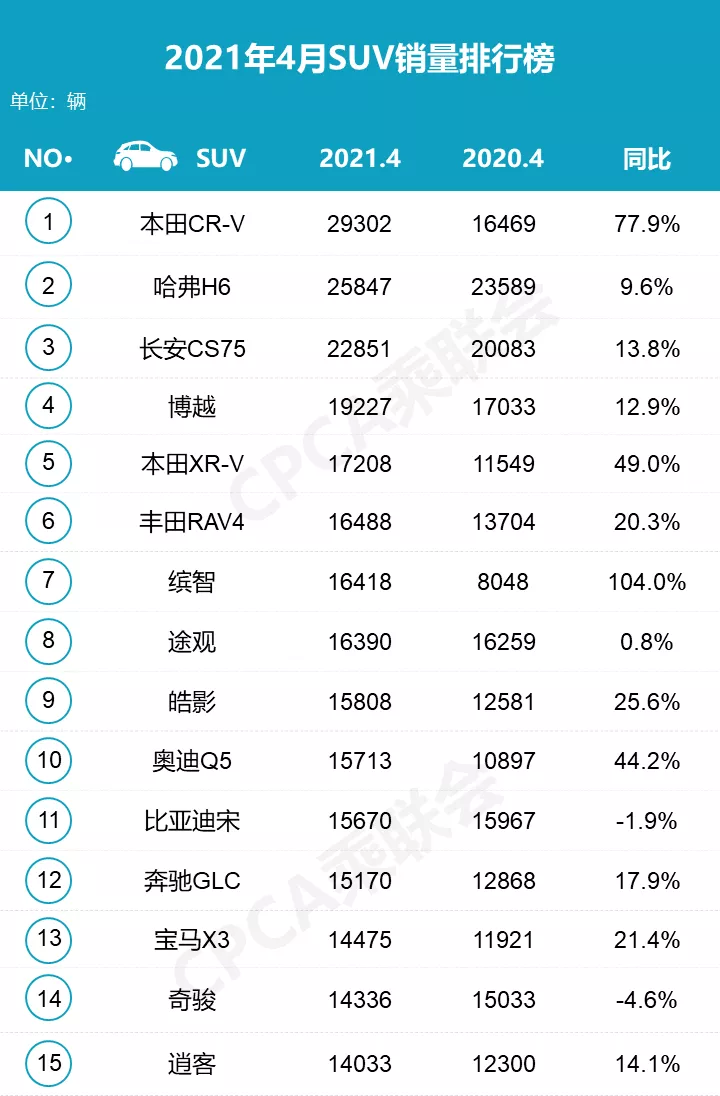 SUV销量榜:本田CR-V夺冠