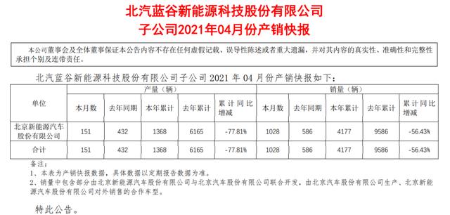 作为曾经新能源汽车的龙头,北汽蓝谷已经失去了当年的风采。5月14日,北汽蓝谷公布最新数据显示,2021年4月销量为1,028辆,较去年同期的586辆增长75.4%;2021年1-4月累计销量为4,177辆,较去年同期的9,585辆下滑56.43%。