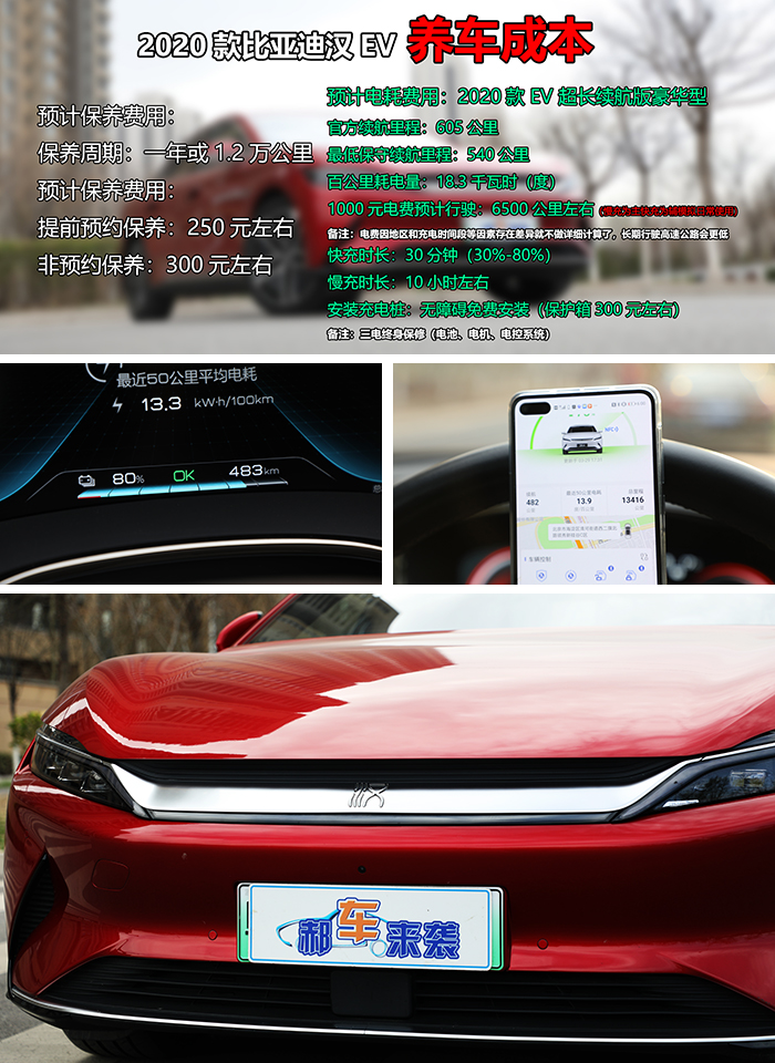 比亚迪汉EV官方续航605公里,根据个人行驶路况不同,估计最低保守续航也能在540公里以上,郝哥以慢充为主快充为辅模拟日常使用状态计算,1000元电费大概能行驶6500公里,百公里耗电18.3度左右,当然电费也会因地区和充电时间段等因素存在差异。在快充模式下,新车30分钟可从30%充至80%,慢充模式下大概10小时充满,同时安装家用充电桩也是免费的,您还可以自行安装保护箱,费用大概300元左右。以上所有数据仅为郝哥粗略估算,仅供您购车时预算参考。