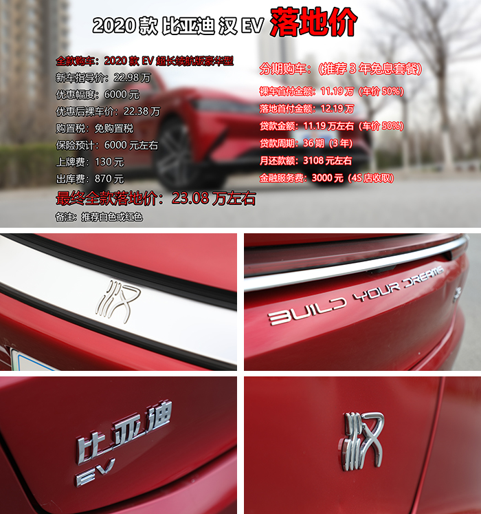 既然选好了车型,那郝哥就来为您算算落地价吧,推荐配置新车指导价22.98万元,优惠6000元以后裸车价为22.38万元,保险费用大概6000元左右,上牌+出库费1000元,由于电动车是免购置税和不限号的,所以最终全款落地价预计为23.08万元,颜色可首选白色或红色。如果想分期购车,郝哥推荐三年免息套餐,裸车首付11.19万元(车价50%),不过由于厂家限制,有些经销商会把优惠幅度分开。金融服务费3000元,再算上保险和出库等杂费,最终落地首付金额12.19万元,贷款11.19万元,分三年36期还完,月供3108元左右,至于选择全款还是分期,就看您的个人需求了。