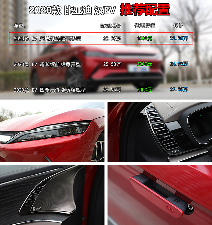 2020款比亚迪汉目前在售五款车型,三款纯电动版(EV)和两款插电式混动版本(DM),今天我们只聊纯电动版车型,根据郝哥暗访北京地区某比亚迪4S店得知,比亚迪汉EV在售三款车型,售价区间为22.98万~27.95万元。通过销售透露,新车目前全系优惠6000元,通过配置分析并结合优惠幅度,郝哥推荐大家首选超长续航版豪华型(低配)。相比超长续航版尊贵型(中配),两款配置相差2.6万元,主要差别为配置上差异,包括并线辅助/车侧预警和自动泊车等安全配置;真皮座椅/座椅腰部支撑/座椅记忆/副驾驶座椅加热通风等围绕座椅的豪华配置,此外还新增了220V电源/多色氛围灯以及后排独立空调等便民配置,说实话基本大部分配置比较鸡肋,增加预算2.6万元来换这些配置确实不太值,毕竟对于电动车来说,续航里程和充电时长才是最关键的,这方面两款配置完全一致,综合续航605公里,快充30分钟左右,慢充10小时左右。