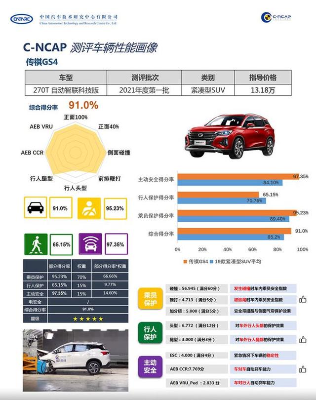 回顾C-NCAP公布的2021年第一批车型碰撞成绩,其中传祺GS4以91.0%的综合得分率,获得五星安全评价,从2020年至今,C-NCAP碰撞的七款紧凑型SUV中,传祺GS4分数排名第二,整体得分超过曾参与测试的丰田RAV4荣放、奔驰GLB、捷达VS5等合资车。