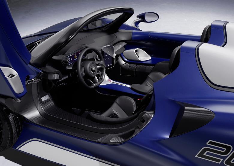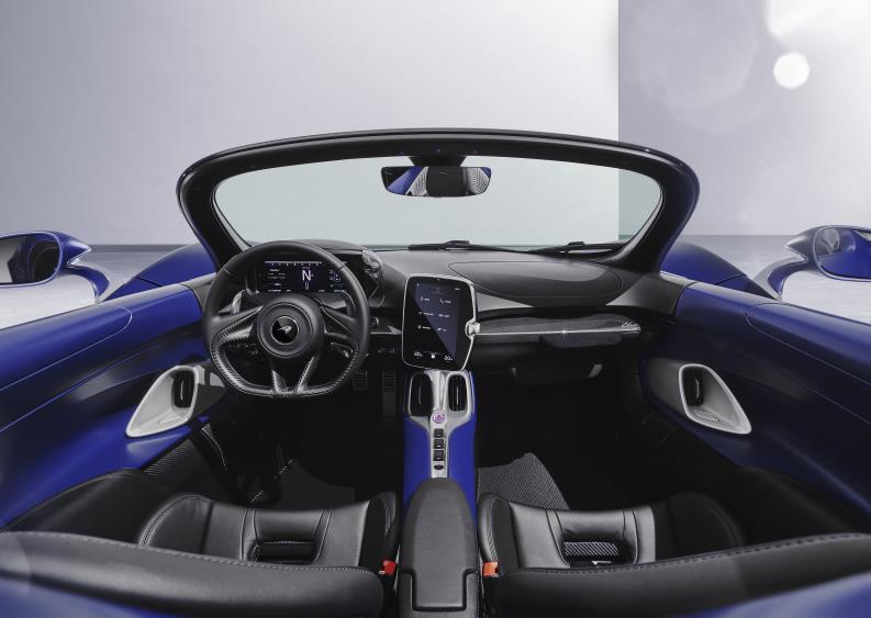 进入车内,2021款迈凯伦Elva的内饰搭配了黑色和紫色的配色,显得更为符合当下的潮流,而在用料和做工方面,加入了大面积碳纤维的材质,空调出风口处还点缀有金属质感的银白色的装饰件,使得新车看起来逼格很高,而三幅式多功能方向盘由黑色皮革和碳纤维拼接包裹,手感很足;在配置上,像液晶显示屏、全液晶仪表盘等等,为新车增添了几分科技气息。