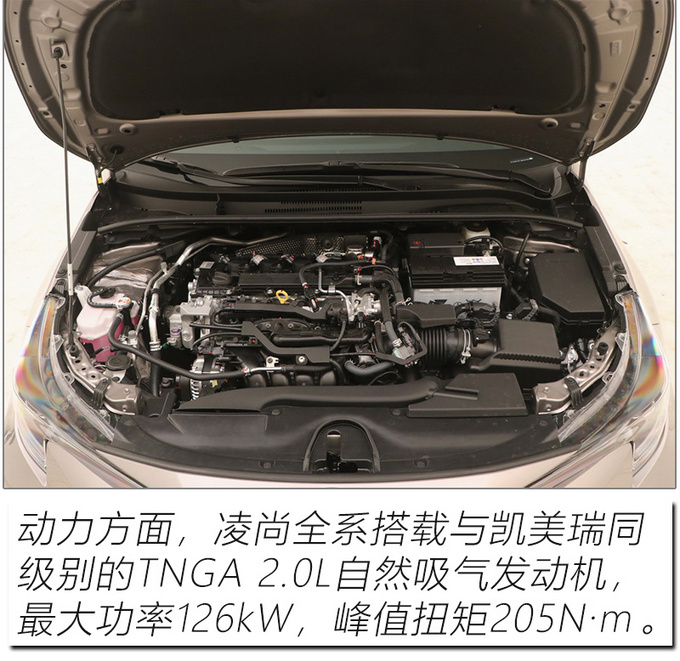 此次凌尚的动力是其优势,搭载与凯美瑞同级别的TNGA 2.0L自然吸气发动机,最大功率126kW,峰值扭矩205N·m,尽管与凯美瑞上的那款动力有些许差距,但是面对同级竞品的小排量发动机来讲还是很有优势的。而且这款发动机还采用了丰田多项领先黑科技,最大程度地发挥发动机潜能,可实现40%的热效率和高输出功率,配合可模拟出10速的CVT变速箱,使其带来澎湃动力的同时,也兼顾了领先同级的驾乘平顺性。