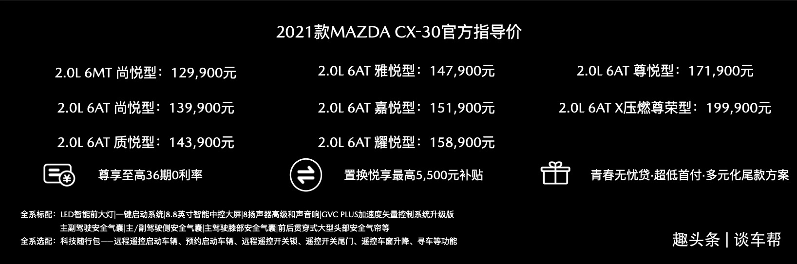 除多项舒适、智能升级外,2021款MAZDA CX-30还全系标配有:LED智能前大灯、一键启动系统、8.8英寸智能中控大屏、8扬声器高级和声音响、GVC PLUS加速度矢量控制系统升级版、主/副驾驶安全气囊、主/副驾驶侧安全气囊、主驾驶膝部安全气囊、前后贯穿式大型头部安全气帘等配置,带来更智能、更豪华、更安全的驾控享受。
