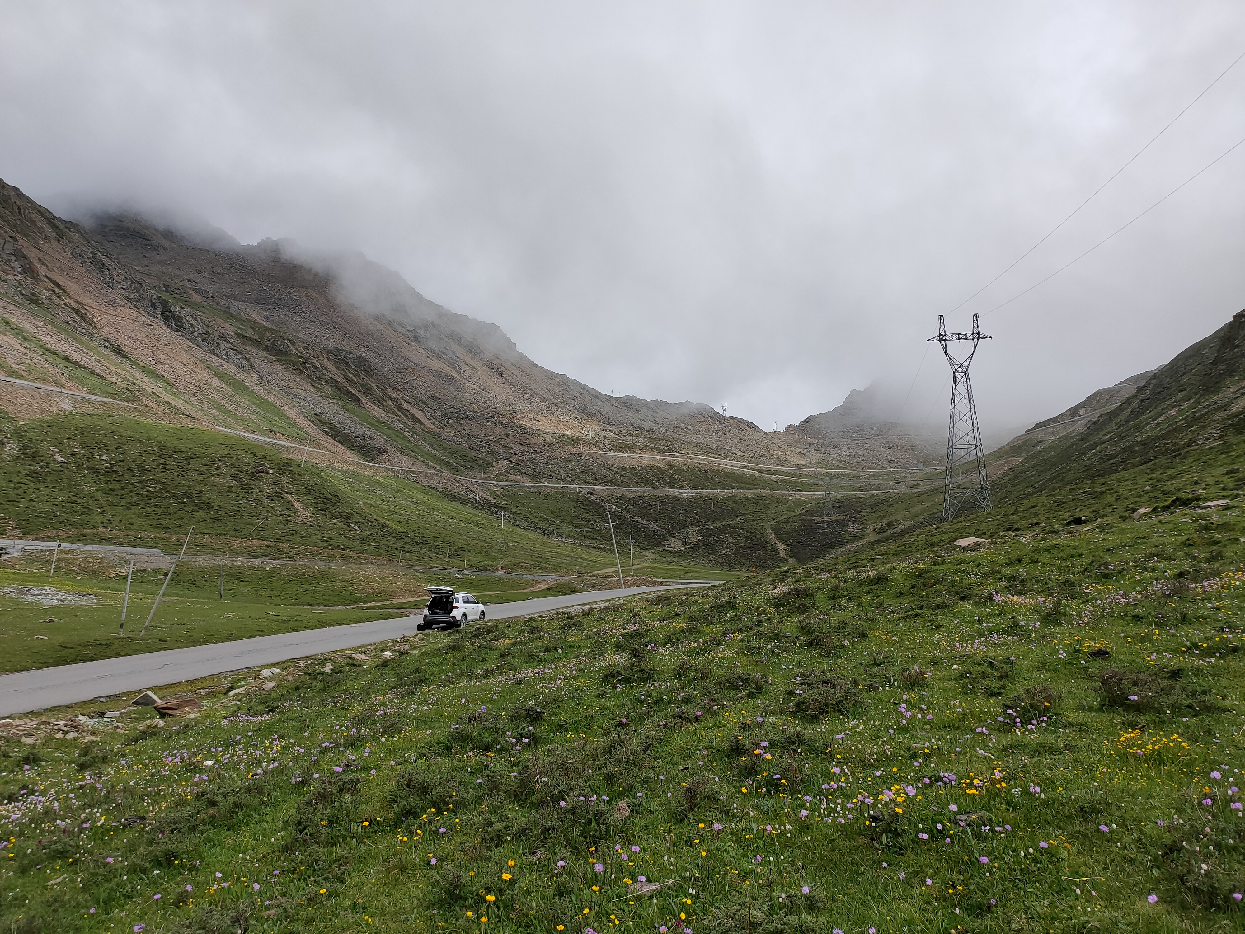 下午5点多我们才到达巴朗雪山,遗憾是去年6月初来雪山很厚的雪,如今6月底全部融化了,但各种高原野花开得正艳。有粉色、黄色、红色、白色等各种花色,美不胜收。巴朗山藏语叫巴郎拉,海拔5040米,看见成群的牦牛怡然自得,茫茫的云海浮动山腰,山上是野花缤纷的高山草甸,山下是神秘幽深的原始森林。