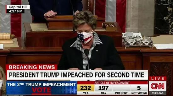 美国会众议院当天下午举行全院表决,并以232票赞成、197票反对的结果通过弹劾条款。这一弹劾条款指控特朗普“煽动叛乱”,称他“多次发表虚假声明”“干扰权力和平过渡”“严重危及美国及其政府机构的安全”,要求对其进行“弹劾和审判,并免除其总统职务,取消其拥有的相关荣誉、信用和有酬职位资格”。