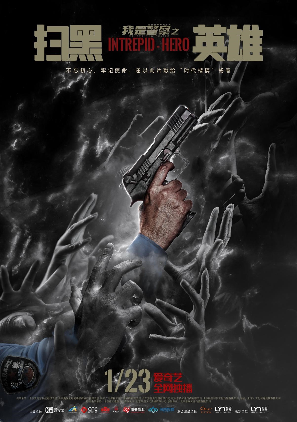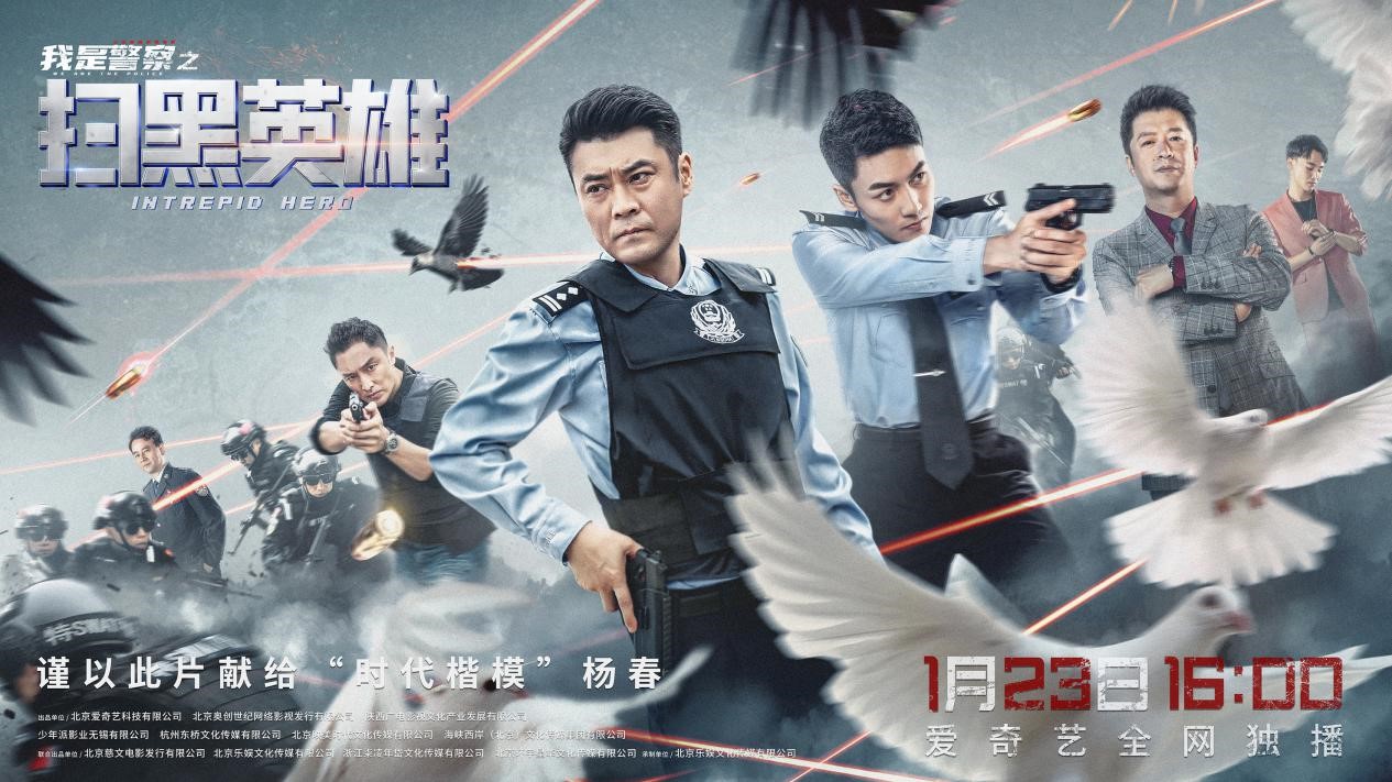 由“时代楷模” 杨春真实事迹改编,公安部新闻宣传局和中国电影家协会联合摄制,殷飞、王磊执导,唐旭、张衣、刘帅、李东翰主演的“我是警察”公安英模系列电影之《扫黑英雄》1月23日在爱奇艺独家上线。目前电影已获得多项殊荣,入选北京市广播电视局“中国榜样”系列网络电影片单和国家广电总局网络视听节目精品工程扶持项目。