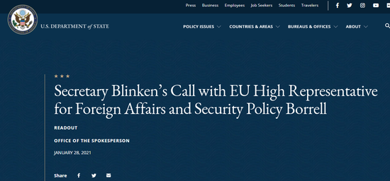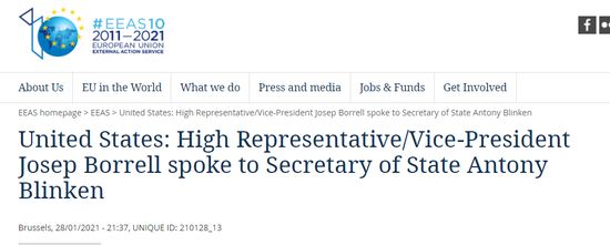 根据美国务院网站发布的发言人声明,布林肯与博雷利28日在通话中讨论了如何“修复、振兴以及提高美国与欧盟关系的雄心”,并“强调了美国与欧盟及其成员国合作,应对包括新冠病毒、气候变化等在内的共的挑战并加强经济合作。